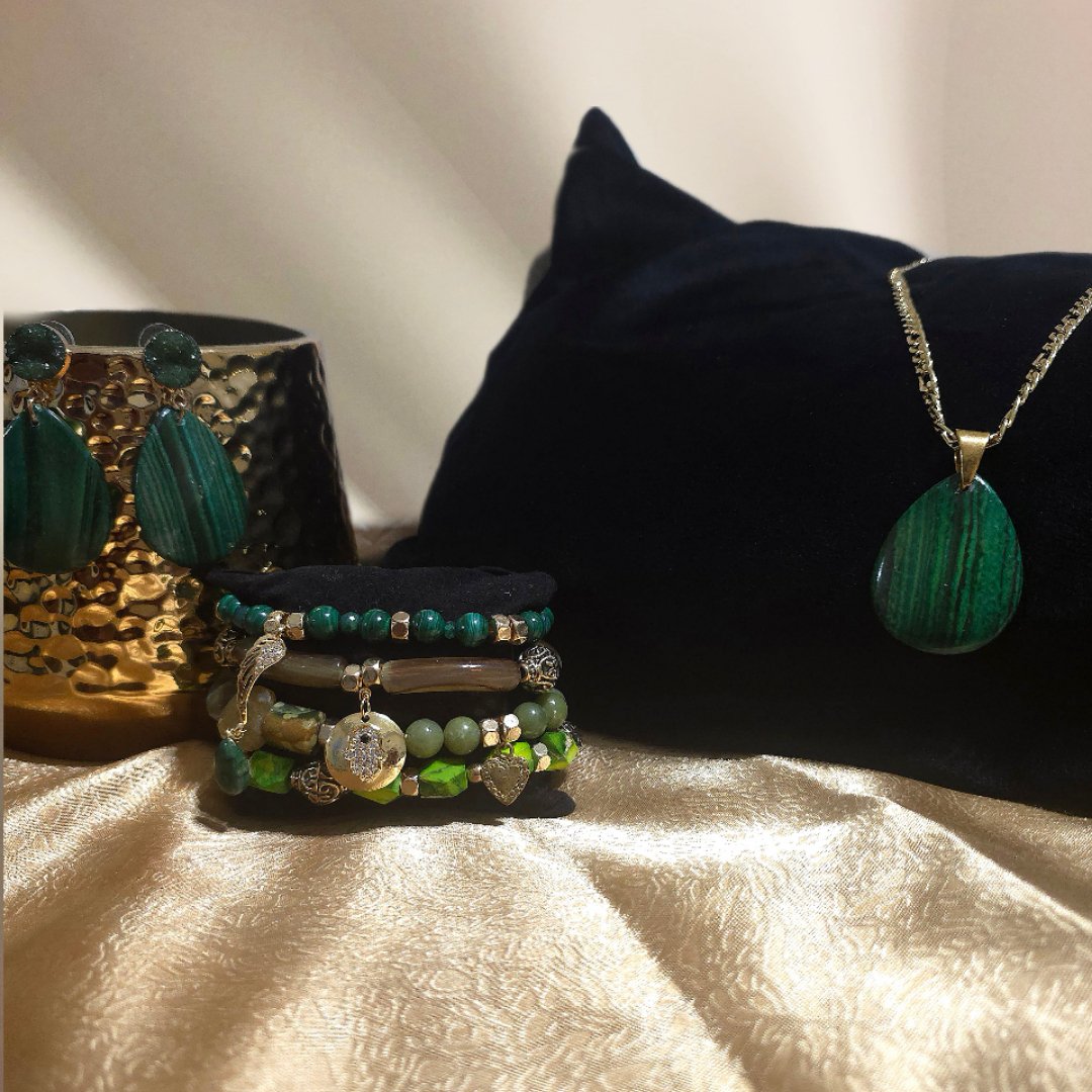 This collection contains authentic malachite jewelry. Some were made with raw gemstones...