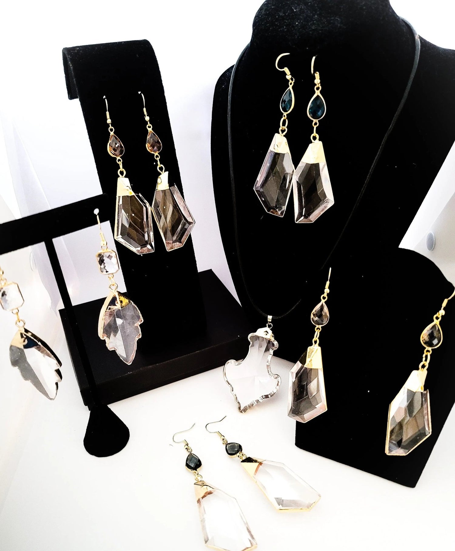 The quartz collection is earrings . bracelets, and necklaces made with druzy...
