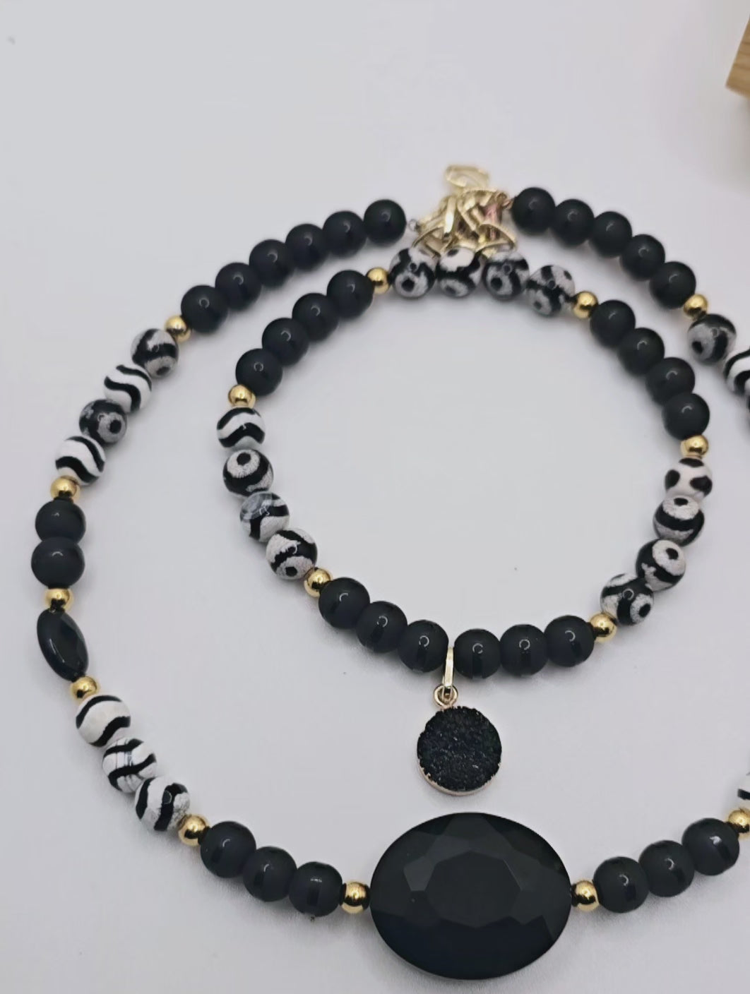 A Universal set that can be worn with anything or styled anyway ! It is an adjustable necklace that can be worn as a 18 inch necklace or choker. Made with 6mm dzi agate and onyx beads, 3mm gold stainless steel beads serve as spacers , with a medium size faceted oval onyx stone as a pendant. The bracelet is made with the same beads but with a druzy agate pendant.