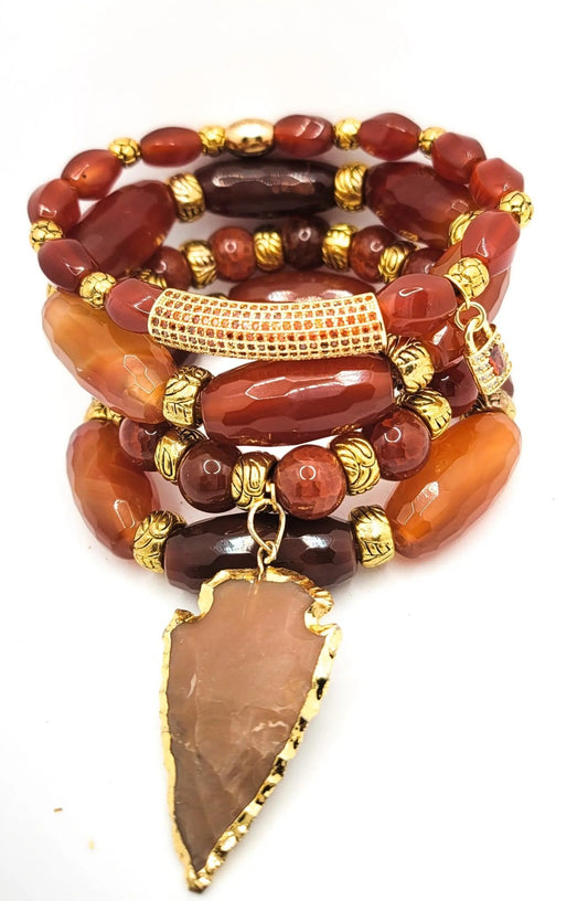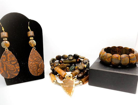 This is a collection of grade AAA semi precious gemstone jewelry with bold designs of necklaces, earrings, and bracelets. Our jewelry for men are genuine leather bracelets and beaded bracelet sets. Our women bracelets are 3pc sets with bangles and gemstone beads.