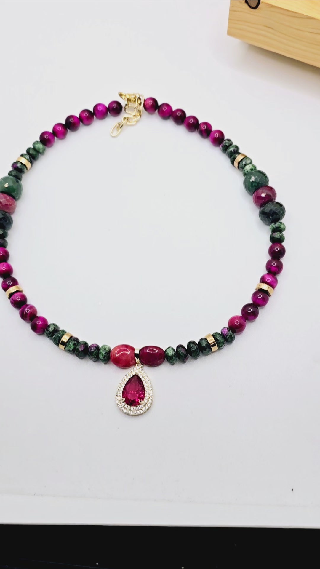 Experience the beauty of this 18 inch necklace, carefully crafted with 6mm fuschia dyed tiger eye beads and 6mn rondelle shaped ruby zoisite beads. Enhancing the design are gold hematite disk spacers, complemented by 10mm natural emerald and ruby stones on each side. The pendant features a faceted tear drop rubellite stone surrounded by sparkling Cz in the middle of two natural oval shaped rubies. This adjustable necklace can extend up to 20 inches, making it a versatile and elegant addition to your jewelry collection. Featuring certified natural ruby and emeralds, this necklace exudes sophistication and is perfect to pair with a white collar shirt, handbag, or v-neck dress as the focal point of your outfit.