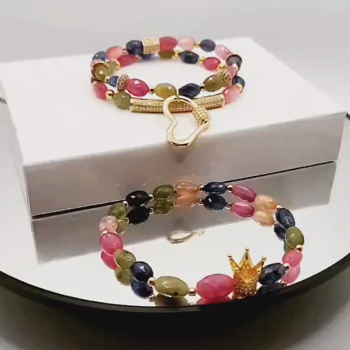This 3pc. set is made with natural multicolor sapphires faceted gemstones, 4mm 14k gold beads, 4mm 18k gold plated pyrite stones, with pave' diamonds spacers. Multicolored sapphire crown with diamonds and pyrite stones by Jewels of the Universe.