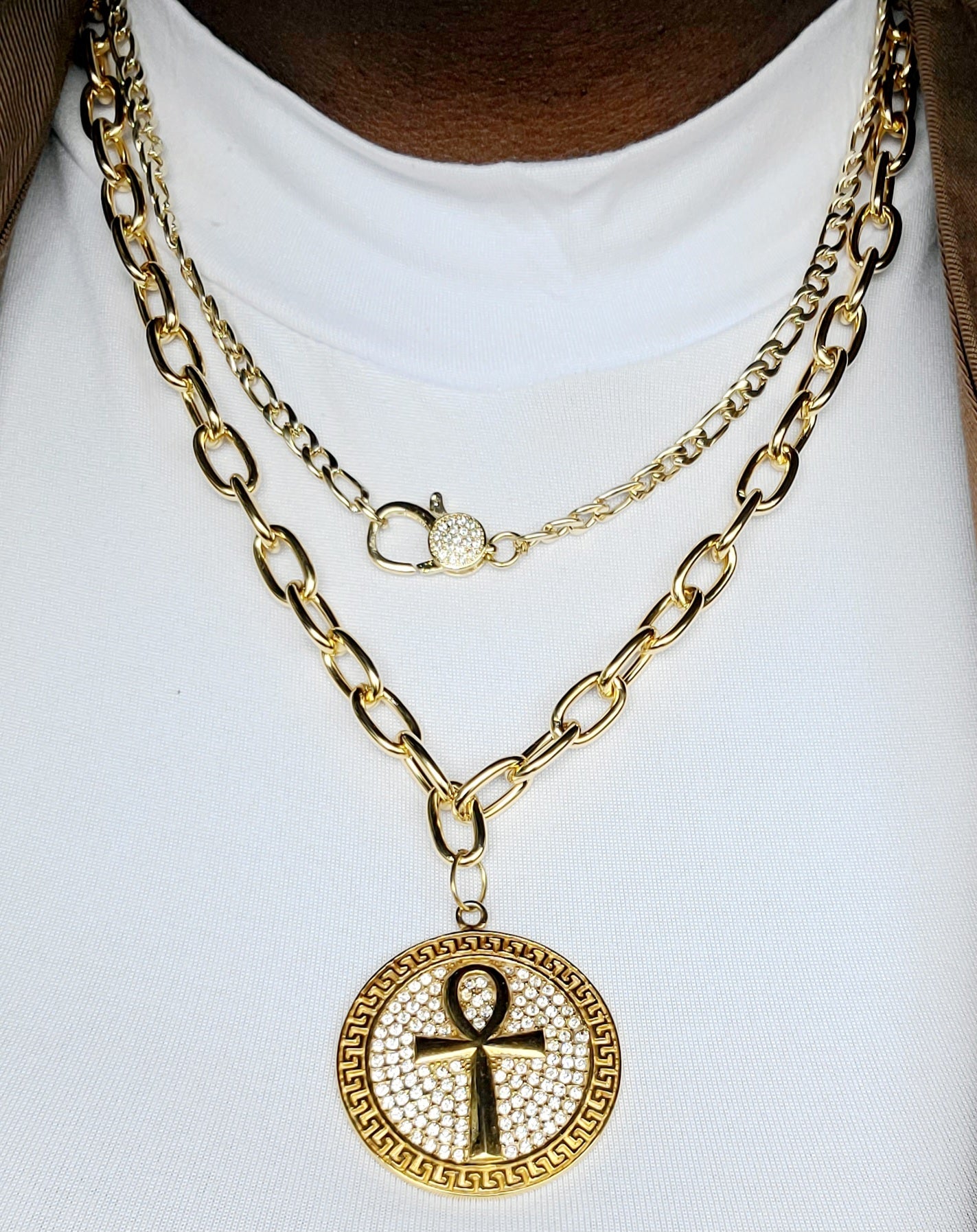 Is 18k gold plated chain link Necklace. Also has a micropave' lobster claw. The ankh pendant is stainless steel. Want a simple look or it can be part of your layer necklace look. Make the chain link necklace part of your jewelry collection!