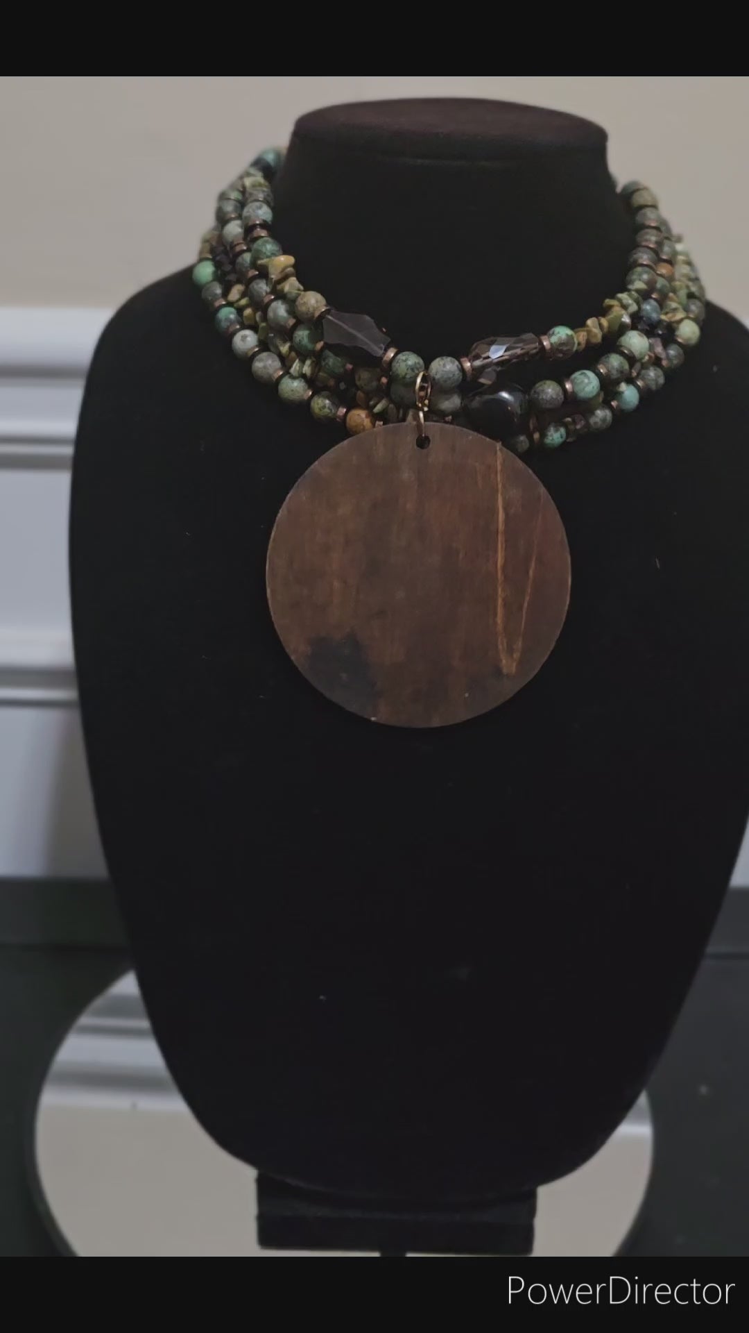 Is beautiful designed with 8mm natural African turquoise beads and the chip beads. In between each beads are 4mm Smoky Quartz rondel beads and bronze dyed hematite disks. First layer has irregular shaped smokey quartz beads. Pendant is natural wood. Expertly crafted from high-quality, natural materials. Enjoy the wellness benefits of African Turquoise and Smoky Quartz while making a statement of style. Perfect for any occasion.