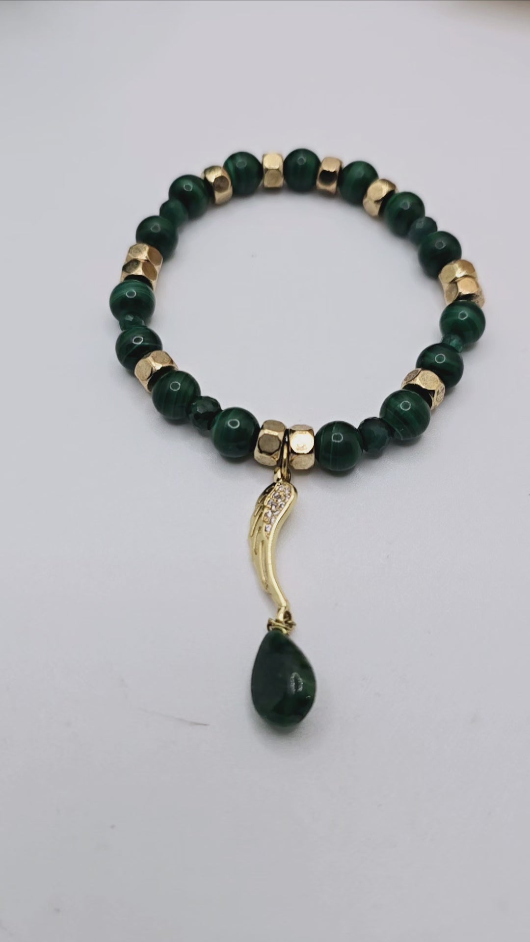 This coveted bracelet is in high demand and frequently purchased for good reason. It boasts genuine, premium grade AAA 6mm smooth round malachite beads, a valuable and rare gemstone. For added luxury, the beads are paired with 4mm faceted rondelle Certified Columbian Emerald beads. The bracelet also features a delicate gold wing charm adorned with a beautiful tear drop shaped Columbian Emerald stone. It comes with a certificate of authenticity and a 1 year warranty, making it an ideal gift choice.