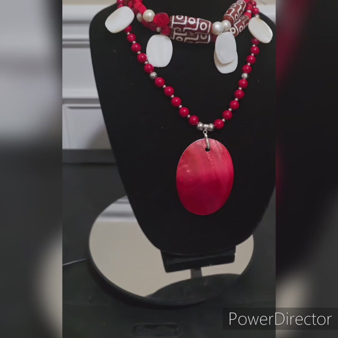 Experience the unique and exquisite beauty of our Red Coral and Shell Choker Necklace Set. Each piece is carefully crafted with certified irregular red coral beads, 8mm in size. The pendant is a striking red dyed sea shell, accompanied by red and silver beads as spacers. The choker consists of two strands, featuring tibetan jasper tubes, coral beads, and accents of freshwater pear beads. Adding to its charm are the delicate white shells that adorn the first layer. .