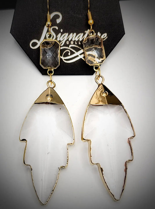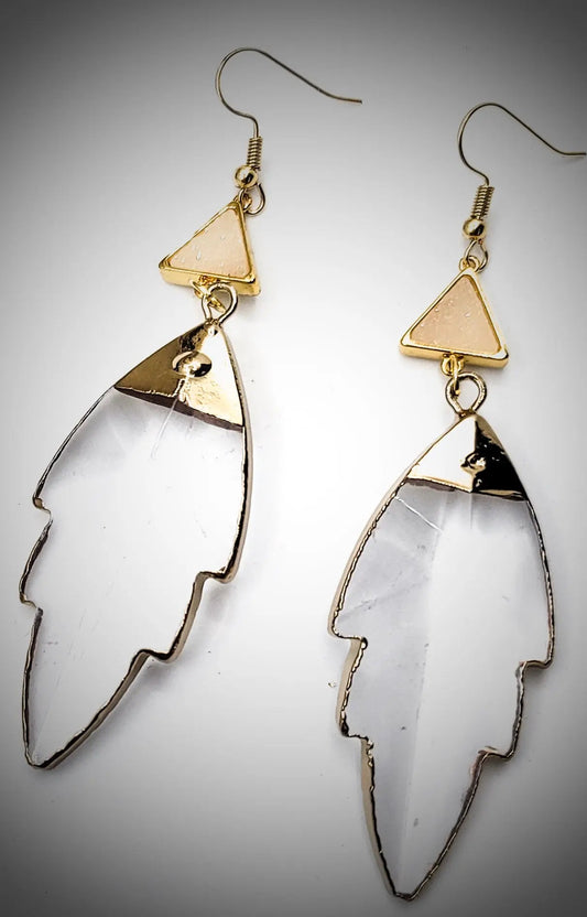 Clear Quartz Leaf Earrings "Peach Druzy"