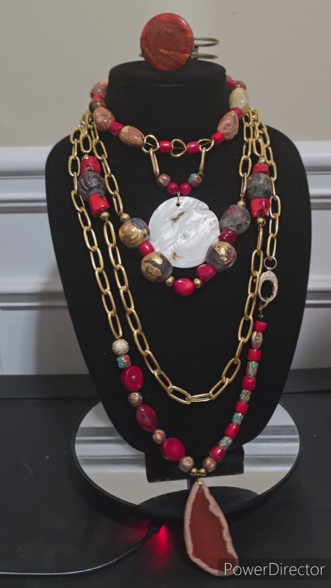 This distinctive 4pc. layered necklace features Certified coral irregular shaped beads and 8mm coral round beads. To achieve an antique appearance, it incorporates large clay beads. The choker layer includes red lace agate irregular shaped beads, coral beads as spacers, and 10mm round red jasper beads. Premium quality 18k gold Plated chain links complete the design. Adding to the finished look are antique Turquoise and coral spacers, along with large white shell pendants to balance the colors and a natural red agate stone..